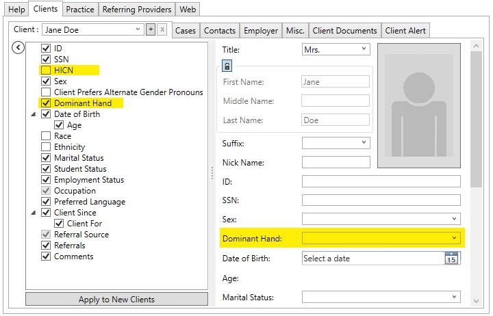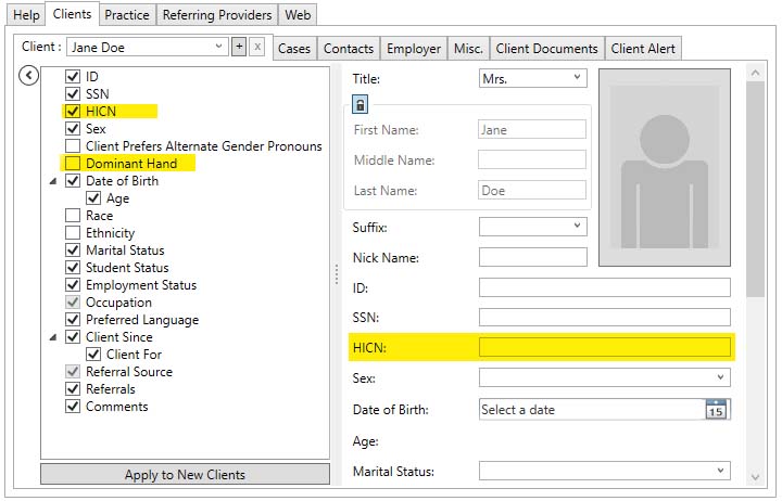 If we want, we can check the HICN checkbox to reveal the HICN entry field, and we can uncheck the Dominant Hand checkbox to hide the Dominant Hand field: