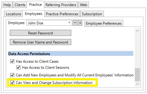 Only employees who have the "Can View and Change Subscription Information" checkbox checked have access to the Subscription tab and are allowed to: